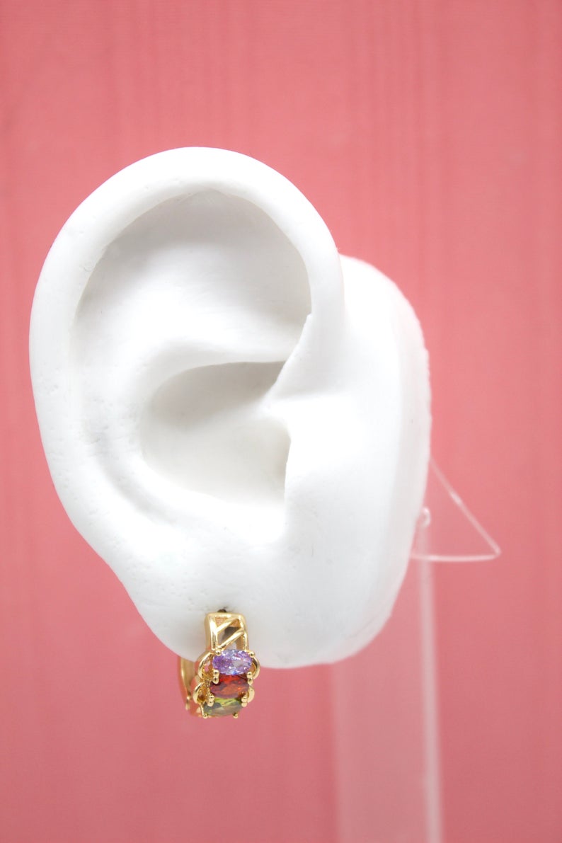18K Gold Filled Huggies Earrings With Oval MultiColor CZ Cubic Zirconia Stones (STYLE BB)